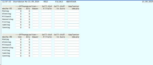 Um zu planen muss man die "Öffnungszeiten" und die "Soll- Std.-Filiale" hinterlegen. Es werden nur die Wochen bzw. Tage geplant, bei denen diese Werte hinterlegt wurden.